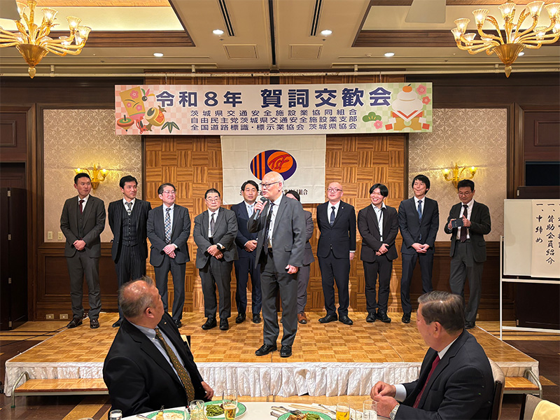 当組合(小又純理事長)と自由民主党茨城県交通安全施設業支部(須藤豊次支部長)、全国道路標識・標示業協会茨城県協会(宇都宮浩協会長)との3者共催による賀詞交歓会を、令和8年1月16日(金)に水戸プラザホテルで開催しました。